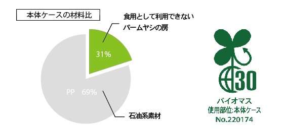 従来品に使用されている石油系素材の変わりに、パームオイルを採取した後、農業廃棄物として捨てられていたパームヤシの房を31%本体ケースに使用しました。それにより*従来品に比べ温室効果ガスの排出を抑え環境に配慮されています。*当社比