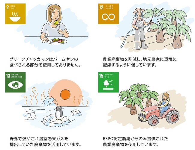 パームオイルを採取した後の房を含む副産物は、農業廃棄物として野外で燃やされ地球温暖化ガスを排出していました。それをグリーンチャッカマンに使用することで捨てられるだけの廃棄物を活用し、燃やす際に排出されていた地球温暖化ガスを減らすことができます。