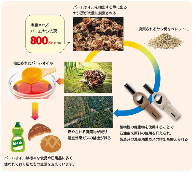 また原料に使われているパームヤシの房はパームオイルを採取した後の農業廃棄物として野外で燃やされ温室効果ガスを排出していました。