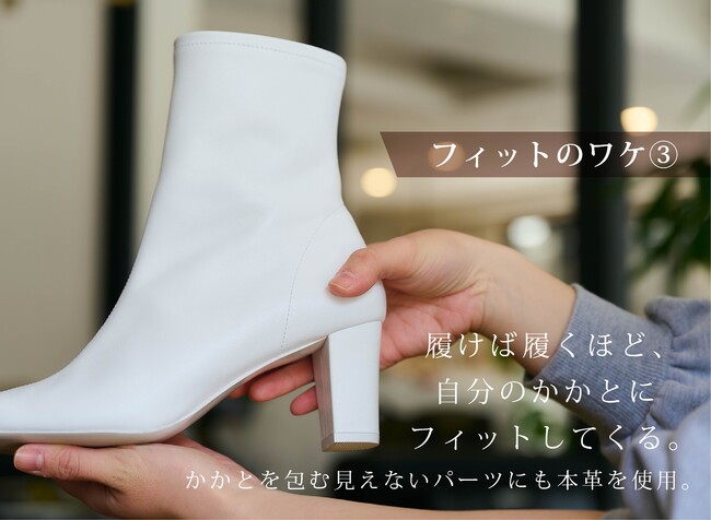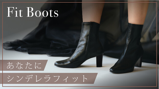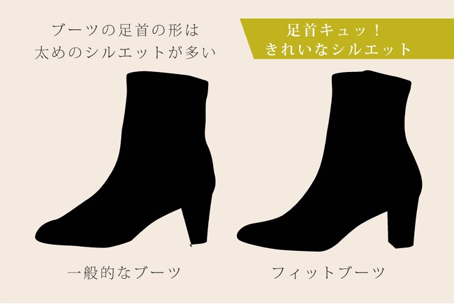 ブーツは、筒の足首部分がまっすぐなシルエットのものが多いですが、フィットブーツでは、履いた時の姿が足元から美しくなるよう新たに木型を開発。足首がキュッ! と見える、きれいなシルエットをめざしました。