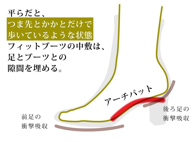 フィットブーツの中敷には、まるで雲の上を歩いているかのようなフィット感をめざしたフワフワの低反発素材を使っています。 また、土踏まず部分に低反発素材のパッドを入れることにより、足とブーツの隙間を埋めています。これがストッパーの役割も担っており、ブーツの中で足が前に滑りにくくなります。 中敷とパットによって、足の裏全体を受けとめ、フィット感をアップさせています。