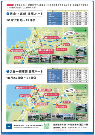 運行ルートは、10月17日(火)~10月19日(木)伏倉・道部地区循環、10月24日(火)~10月26日(木)伏倉・商店街循環を予定している。