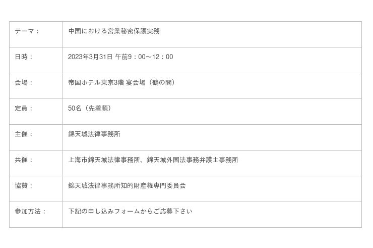 ■パネルディスカッション:中国における営業秘密侵害事件の争点、立証責任、鑑定ポイント、刑事告訴の難点と対応策、懲罰的損害賠償など権利者側にとって関心の高い問題点に触れながら、日中法律実務を比較する観点も含めて知財裁判官、知財弁護士、法学者がデスカッションを行う予定です。