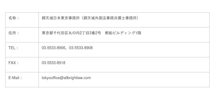 東京事務所は、「外国弁護士による法律事務の取扱いに関する特別措置法」に基づき、当事者または官公署の委嘱により中国法に関する法律事務を行うことや国際仲裁・国際調停事件の手続きについての代理、外国法事務弁護士の業務に関連する講演会の開催、出版物の刊行、他人の事業および財務状況、資産の価値等の外国法に関する法律事務について調査、証明の業務、日本の弁護士・弁護士法人との共同事業を行うことができます。