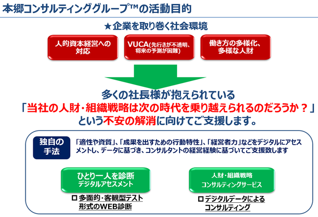 「本郷コンサルティンググループ (TM) (略称 本郷CG) 」は、経営者の想いに寄り添い、企業毎の事業・職務に必要な人財の資質や行動特性などをDX手法のアセスメントでデジタル化して測定し、従来の人事情報に融合させた「人的資本人財データ(xHumanCapital(TM)<クロスヒューマンキャピタル>人財データ)」を駆使し、企業の経営戦略とリンクする人的資本経営における"将来に向けての一手"に資する、人財戦略・組織戦略策定、最適な人的投資の判断をスピーディーにご支援致します。