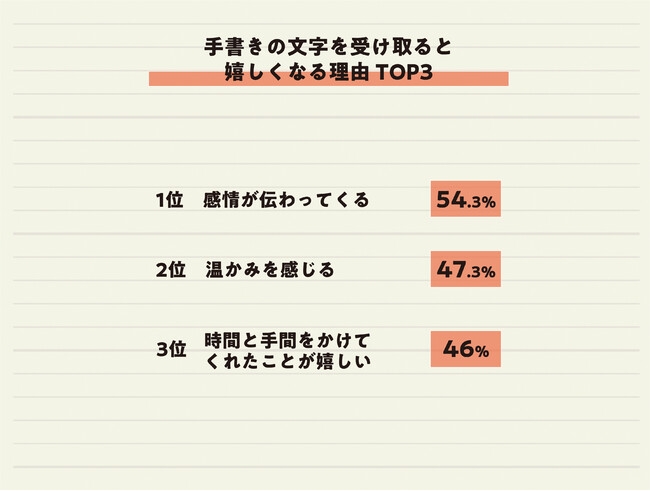 嬉しい気持ちになる理由としては、1位「感情が伝わってくるから(54.3%)」、2位「温かみを感じるから(47.3%)」、3位「時間と手間をかけて書いてくれたと思うから(46.0%)」という結果に。