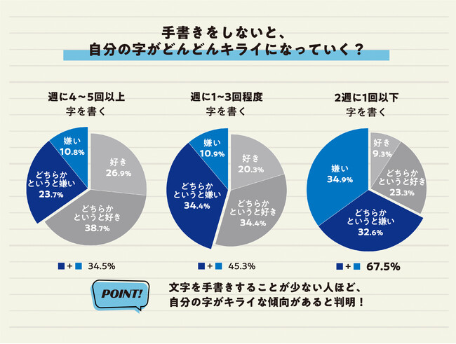手書きする頻度と自分の字が好きかどうかの関係を調べたところ、「週に4~5回以上」手書きする人の約3割(34.5%)が自分の字を嫌いとする一方、「2週間に1回以下」しか手書きをしない人では約7割(67.5%)が自分の字を嫌っており、文字を手書きすることが少ない人ほど自分の字を嫌いになる傾向があると判明しました。