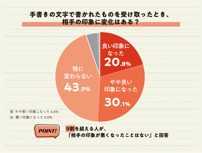手書きの文字で書かれたものでのやり取りや受け取った側に、手書き文字を受け取った時の相手の印象の変化を質問したところ、約9割の人が相手の印象が悪くなったことはない(94.8%)と判明しました。むしろ、半数以上の人が「良い印象になった(50.9%)」と回答しており、手書き文字を受けとっても印象が悪くなることは少ないことが明らかになりました。