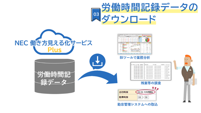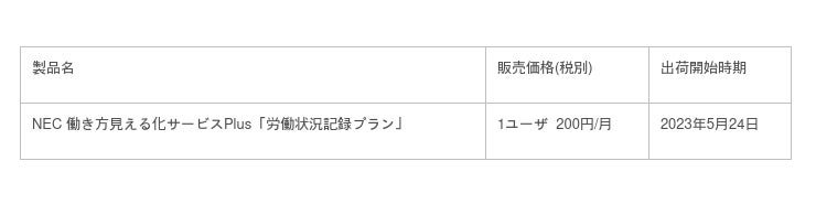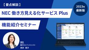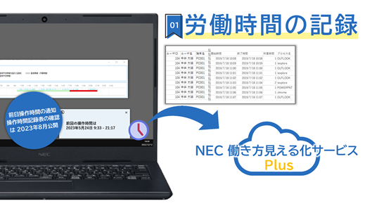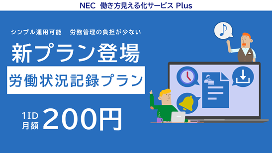 NECソリューションイノベータは、業務可視化を支援するクラウドサービス「NEC 働き方見える化サービス Plus」の 従来のプラン(ライトプラン、スタンダードプラン、アドバンスプラン)に加え、「労働時間の記録」「残業時の注意喚起」「労働時間記録データのダウンロード」の3つの機能に絞った「労働状況記録プラン」を、本日より提供開始します。
