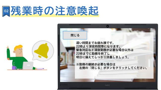 NECにおいても深夜時間帯ならびに休日勤務に対する注意喚起として利用し、勤務に関する基本ルールや勤務システムへの正しい登録の仕方が掲載されたページへ遷移することにより、従業員が既存のルールを再認識できるように本機能を利用しています。