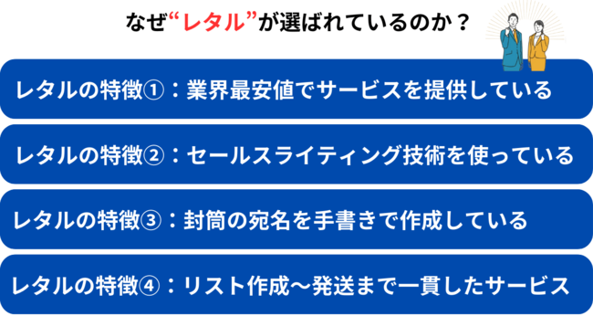 レタルでは、月額9.8万円の業界最安値でサービスを提供しております。(※日本国内における「手紙営業代行サービス」として 2023年3月 自社調べ)