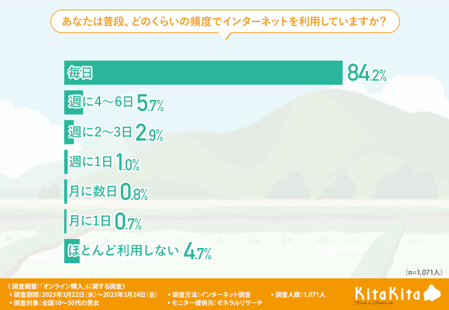 「あなたは普段、どのくらいの頻度でインターネットを利用していますか?」と質問したところ、『毎日(84.2%)』と回答した方が最も多く、次いで『週に4~6日(5.7%)』『ほとんど利用しない(4.7%)』と続きました。
