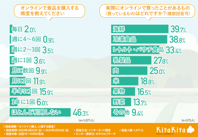 オンラインで食品を購入する頻度や、購入しているものが分かりました。
