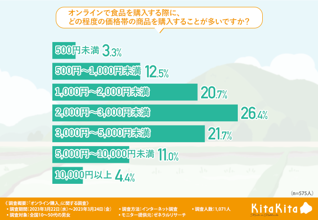 そこで、「オンラインで食品を購入する際に、どの程度の価格帯の商品を購入することが多いですか?」と質問したところ、『2,000円~3,000円未満(26.4%)』と回答した方が最も多く、次いで『3,000円~5,000円未満(21.7%)』『1,000円~2,000円未満(20.7%)』と続きました。