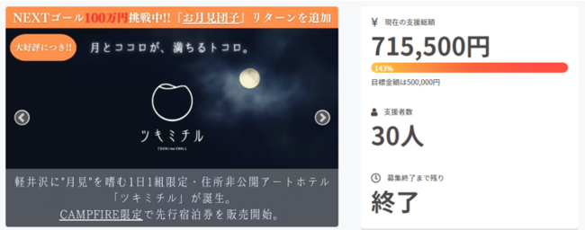 2023年3月1日に開始したCAMPFIREでは、先行宿泊権を販売し目標金額の500,000円を達成いたしました。3月31日(金)のプロジェクトクローズには、目標に対して143%の合計715,500円を達成することが出来ました。