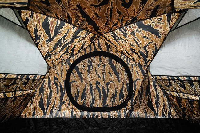 Maharishiは1960年代のベトナムで生まれた「ゴールデン・タイガースキン」と呼ばれる珍しいタイガーストライプの迷彩柄を再現しました。Maharishiではこの柄をゴールデンタイガーストライプカモフラージュと呼んでいます。この柄はこのコラボレーションテントのインナーテントに使用され、カモフラージュのルーツである自然や芸術家による開発への賛辞の想いが込められています。