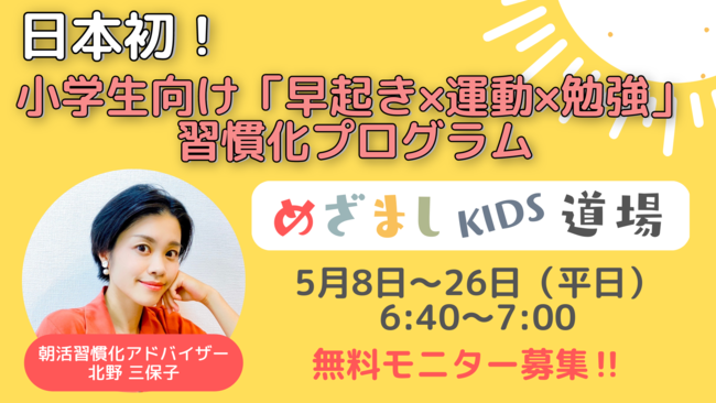 子ども向けオンライン習いごとサービスを展開する株式会社RINABO(本社:東京都渋谷区、代表取締役社長:苗村 立花子)は、小学生を対象にした朝活習慣化プログラム【めざましKIDS道場】を2023年5月8日より提供開始いたします。