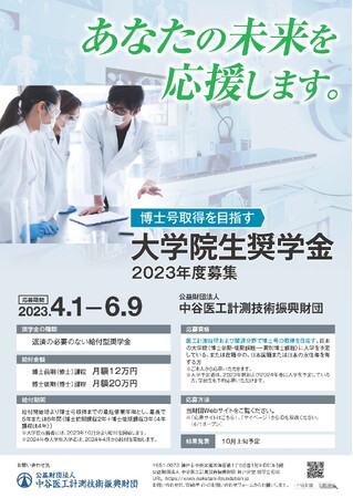 医工計測技術分野における技術開発や技術交流等の促進、及び人材の育成を目的に幅広い助成事業を展開している公益財団法人 中谷医工計測技術振興財団(東京都品川区/代表理事:家次 恒、以下「中谷財団」)は、2023年度(令和5年度)の大学院生奨学金の奨学生(第7期生)募集を開始したのでお知らせします。大学院生を取り巻く経済環境を考慮し、2023年度から給付奨学金を2割~3割増額しました。