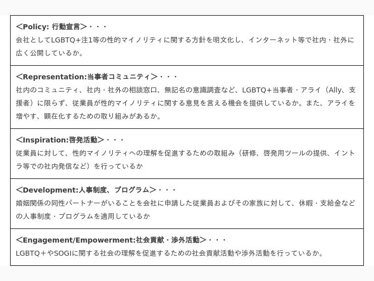 企業として明文化された方針や社内制度など、以下の5つからなる評価指標。2022年には、国内の企業・団体402社(グループ応募、またはグループ・ホールディングス内複数社連名による応募は842社)より応募がありました。2023年の応募企業数及び受賞企業は『work with Pride 2023』カンファレンスの当日に発表いたします。