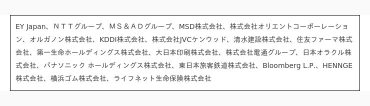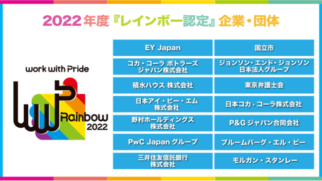 EY Japan、国立市、コカ・コーラ ボトラーズジャパングループ、ジョンソン・エンド・ジョンソン日本法人グループ、積水ハウス株式会社、東京弁護士会、日本アイ・ビー・エム株式会社、日本コカ・コーラ株式会社、野村ホールディングス株式会社、P&Gジャパン合同会社、PwC Japanグループ、ブルームバーグ・エル・ピー、三井住友信託銀行、モルガン・スタンレー