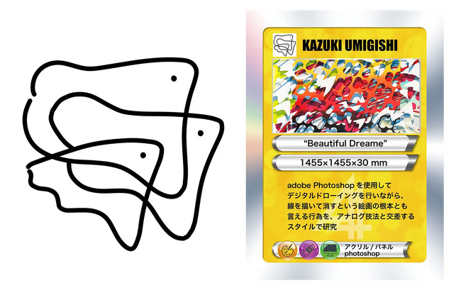 東京藝術大学美術学部絵画科油画専攻卒業。大学卒業後は壁画制作やデザイン会社勤務などを経験したのちフリーランスのグラフィックデザイナーとして活躍。シェイプドキャンバスを使用したオーバーラップ(Overlap)シリーズは、レイヤーの積層による重なりという意味はもちろん、30年近く前に小学校のパソコン室でペイントツールとマウスで描いたガタガタの線の感動から、油絵で抽象画ばかり描いていた大学時代、可愛いキャラクターのようなモチーフを描いていた壁画制作、自分の制作なんて到底できないデザイン会社勤務時代など、それぞれの時代、カルチャー、スタイル、環境であくせくしていた自分がオーバーラップしながらできあがったシリーズ。