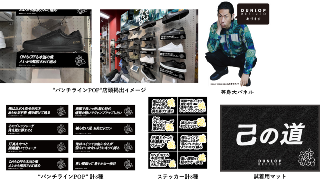 なお、公認大使の取り組み第1弾として、4月17日からはシュープラザ上野店の「DUNLOP REFINED」特設ブースにて呂布カルマ氏とコラボレーションした販促ビジュアルや、シューズから着想を得て生まれたパンチラインを活用した店頭ツール”パンチラインPOP”を初公開いたします。