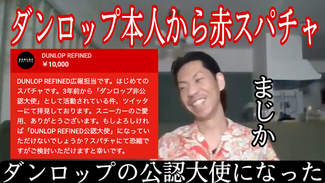 自称「ダンロップ非公認大使」としてTwitterなどで発言しており、活動といった活動は特にしておらずただ履いているだけでしたが、今回のオファーはとてもありがたく、自分にとっては1つ夢が叶う瞬間なので当然やらせていただきたいですとお返事しました。公認になるということは、契約料もバチンともらえるんでしょうけど(笑) これまでの活動で良いのであれば是非やらせていただきたいです。「DUNLOP REFINED」の公認大使として、何かしら今後も動きがあると思いますので、楽しみにしていてください!
