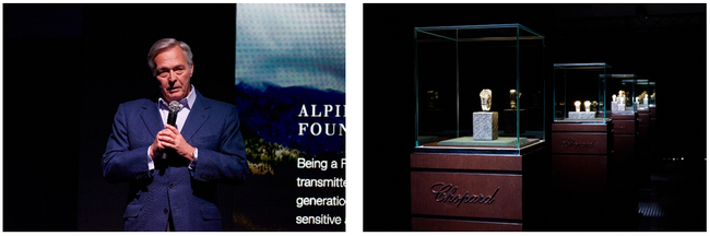 さらに、どのブランドにも欠かせないサステナビリティの取り組みについて「アルパイン イーグルでは、ルーセントスティール™という素材を初めて採用しました。これは80%がリサイクル素材から作られており、将来的にはショパールの全コレクションにこの素材を導入したいと考えています。ルーセントスティール™は、抗アレルギー性、光の反射性、耐摩耗性にも優れています。また、アルプスの保全活動を目的とした財団『アルパイン イーグル ファウンデーション』を設立。当初は野生のオジロワシをアルプスエリアに呼び戻そうという活動からスタートし、最近、最初の4羽のヒナが生まれました。このアルプスの保全活動から、地球が直面しているさまざまな問題へと取り組みを広げていくことが、今のショパールにとってとても大切です」と熱弁をふるいました。