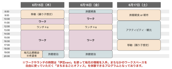 株式会社micro developmentが本社を置く東伊豆町では、これまでまちをまるごとオフィスに見立てた「まちまるごとオフィス東伊豆」(主催:NPO法人ローカルデザインネットワーク、東伊豆町企画調整課)をはじめとしたワーケーション事業を展開し、まちの魅力を首都圏のワーカーの方々に体験していただく事業を実施してきました。この度、伊豆エリアで展開しているデジタルサービス「伊豆navi」とコラボし、ワーケーション企画を開催いたします。つきましては、本イベントへのモニター参加者を募集します。期間は2023年6月15日(木)~17日(土)の2泊3日(1泊2日での参加も可)です。なお首都圏から東伊豆町までの往復交通費については主催者が負担いたします。