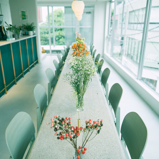 ▼深緑・白を基調とし、花で彩る店内