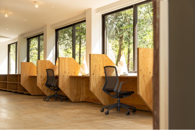 大きく吹抜けた部屋に、皮付き木材に包まれた柱と梁で構成された、開放的で温かみのある空間。景色のいい窓周りには、作業に集中できるようにパーティションで区切られたカウンター席を配置しました。吹抜けの下にはテーブル席やソファ席を並べ、その近くにカフェカウンターを設置。入居者同士の交流を促します。