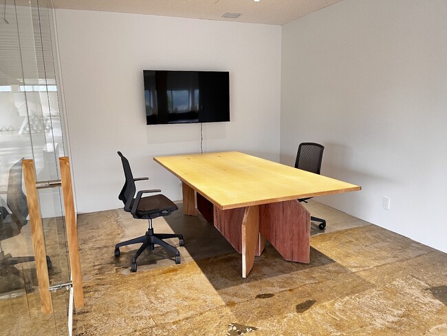 ガラスで柔らかく区切られたミーティングルームは、テレビ会議やミーティングでの利用を想定しています。
