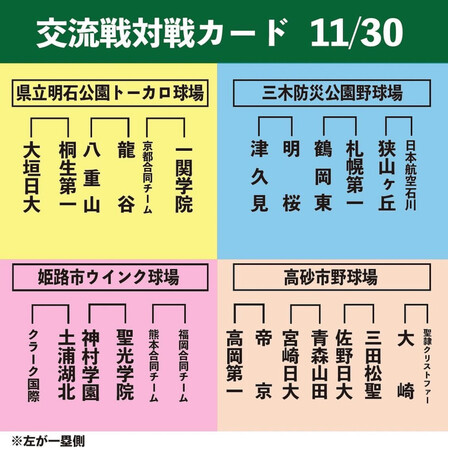 11/30には、県立明石公園トーカロ球場、三木防災公園野球場、姫路市ウインク球場、高砂市球場にて交流戦が行われる予定。