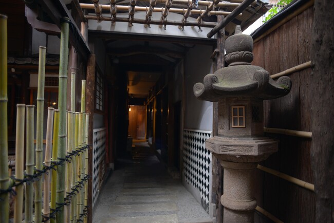 開放的なメインエントランスから中へ入ると、すぐに中庭と池が見え、視界が開けます。そしてそのまま進むと突き当り、右手にあるのが当店です。屋根をそのまま生かした抜け感のある天井により、開放感を感じられる心地よい空間となっています。ブラウンの木部が落ち着いた印象を与える、ぬくもり溢れる癒しの空間です。
