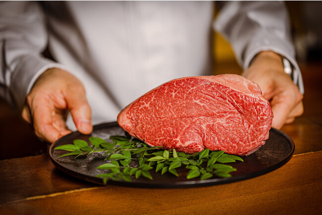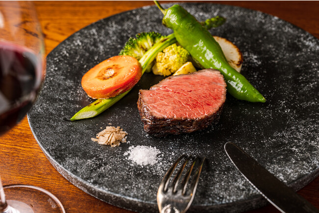 当店では「出来るだけ気軽に美味しくステーキを食べてほしい」との思いから、提供している牛肉は大谷翔平選手の地元でもある「いわて牛」を使用しています。ステーキ肉の本来の旨味を最大限引き出す為に炉窯効果を使い、肉や火入れにトコトンだわっており、素材そのままの味で召し上がってほしいので塩のみで提供しています。今回、更にメインに行くまでの一品一品まで気を使い、アミューズからパスタで徐々に味覚を高めていき、ステーキを食す際にピークへもっていく様に調理いたします。