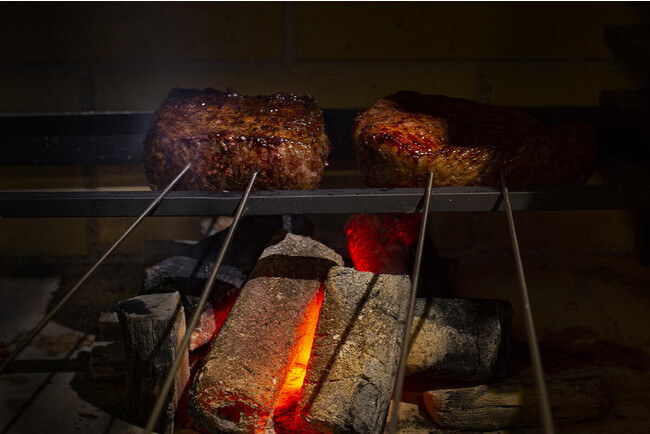 特徴は高温になる炭の直火や遠赤外線による輻射熱、そしてレンガの蓄熱による対流熱によって、炉内全体を高温に保ちオーブンのような状態にすることで、肉に対して高温かつ均一な火入れが可能になります。赤外線の輻射熱は表面を均一に素早く焼き上げて食材を硬化させるため、内部のうま味を閉じこめ、表面がパリッとした焼上がりになり、内部はとてもジューシーに仕上がります。それによってドリップや旨味が零れ落ちないので、旨味が凝縮されて美味しく感じられ、至高のステーキが完成します。