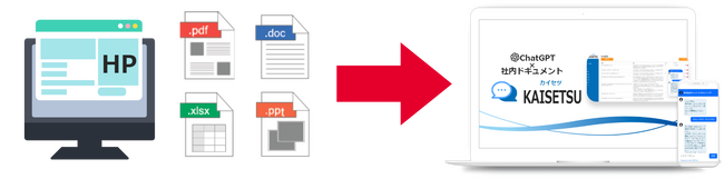 カイセツは、情報整理の手間を一切省き、今あるホームページやドキュメント(MSOfficeやPDFファイル)をカイセツに読み込ませるだけで、簡単に社内のナレッジ情報がデータベース化します。