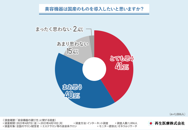 「美容機器は国産のものを導入したいと思いますか?」と質問したところ、『とても思う(41.3%)』という回答が最も多く、次いで『まあ思う(40.9%)』『あまり思わない(15.4%)』『まったく思わない(2.4%)』という回答に続きました。