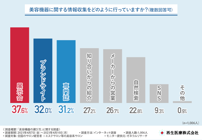 「美容機器に関する情報収集をどのように行っていますか?(複数回答可)」と質問したところ、『展示会(37.6%)』という回答が最も多く、次いで『ブランドサイト(32.0%)』『専門誌(31.2%)』『知り合いからの紹介(27.2%)』『メーカーからの営業(26.7%)』という回答に続きました。