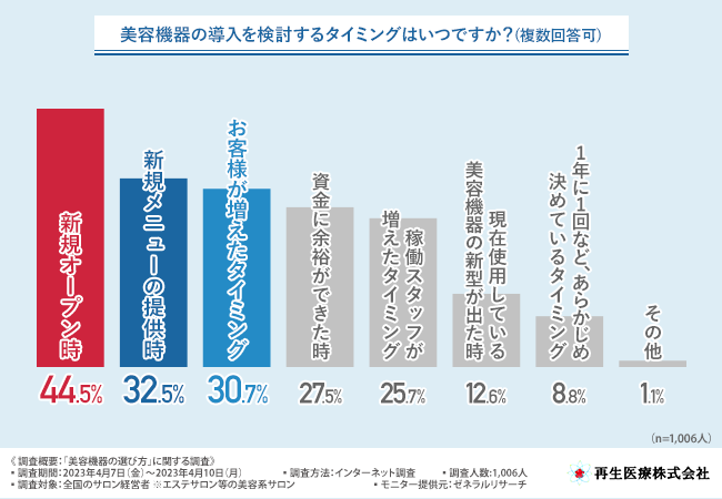 「美容機器の導入を検討するタイミングはいつですか?(複数回答可)」と質問したところ、『新規オープン時(44.5%)』という回答が最も多く、次いで『新規メニューの提供時(32.5%)』『お客様が増えたタイミング(30.7%)』『資金に余裕ができた時(27.5%)』『稼働スタッフが増えたタイミング(25.7%)』という回答に続きました。
