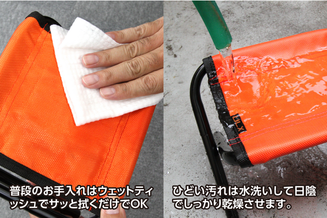 お手入れが簡単なのもうれしいポイントです。釣りやキャンプの際に砂や水が付着しても、サッとひと拭きするだけで落とすことができます。ポリエステル100%の座面は水を吸収しにくく、速乾性があります。泥汚れが付いた場合も丸洗いして陰干しするだけでお手入れ完了です。