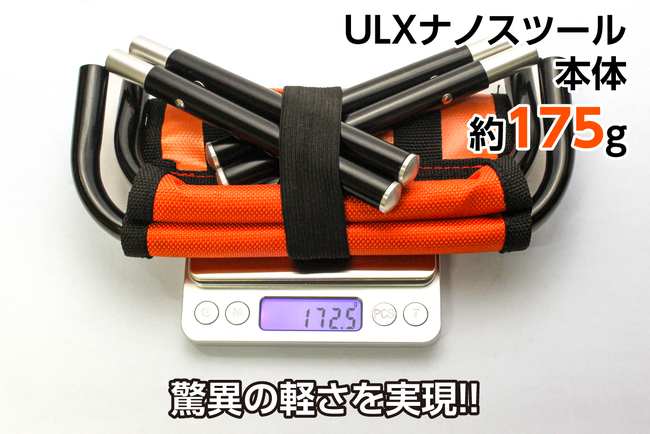 ULXナノスツールは、その名の通り超軽量で極小のパイプイスです。最大の特徴は、「驚異的な軽さ」。缶コーヒー1本分よりも軽い175g。パイプの素材に軽くて強い超々ジュラルミン(A7075)素材を採用し、スチールやステンレス素材に比べて大幅な軽量化を実現しています。