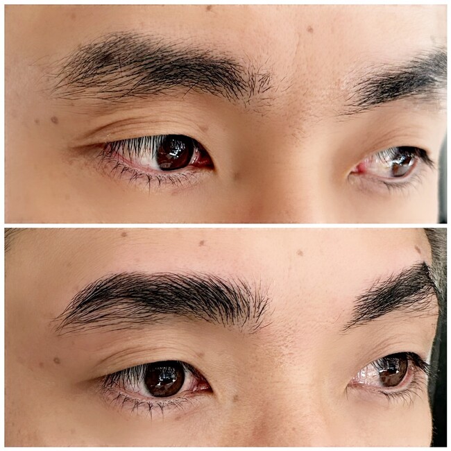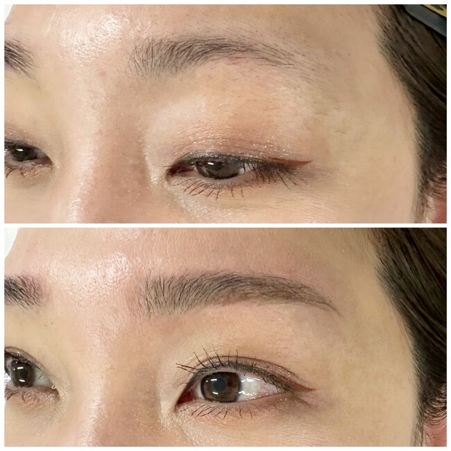 セルフケアでかなり短くシェービングされていた眉毛。しっかりと処理をせずに眉育して毛流れの癖を改善したことで毛量が増えて見えるとともに、メイクのしやすい眉毛に。