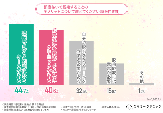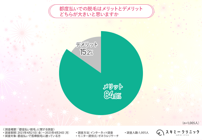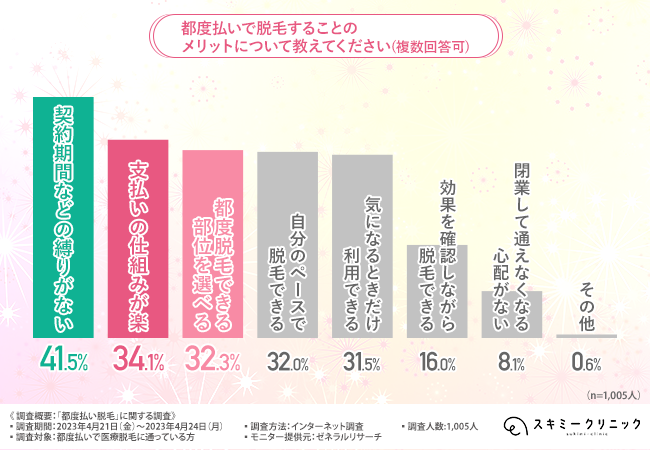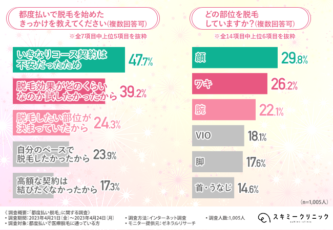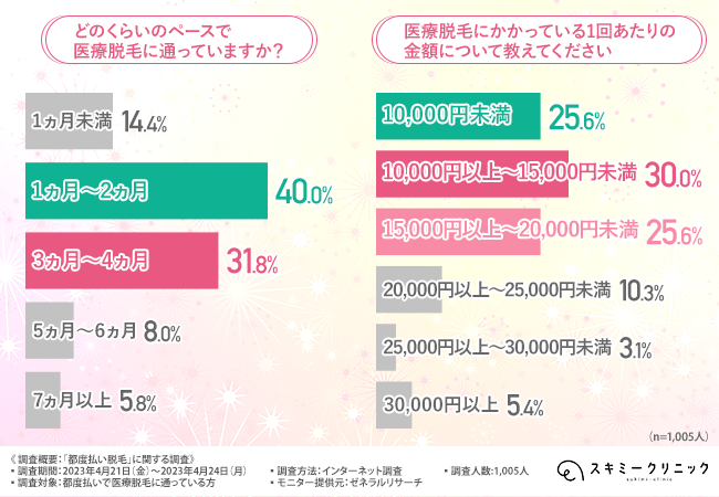 そこで今回、渋谷、梅田、福岡天神にある美容クリニック『スキミークリニック』(https://sukimi-clinic.jp/?refmedia=100025)は、都度払いで医療脱毛に通っている方を対象に、「都度払い脱毛」に関する調査を実施しました。