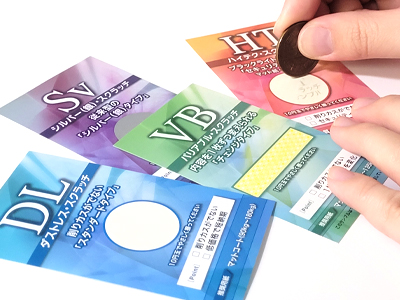 従来の銀スクラッチに比べ、削りカスが出ず衛生的で、スクリーン印刷の過程が省かれることで安価・短納期を実現しています。また他社では出来ない上質紙、カード紙にも対応可能です。
