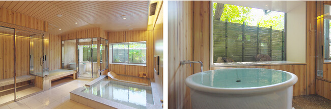 スパエリア「ゆ処」には、家族で楽しむことのできる大浴場と半露天の壺風呂を設置。寝湯やテレビを備えた大浴場でゆっくりとお寛ぎいただけるのはもちろん、こだわりの壺風呂では借景庭園を眺めながらのご入浴もご堪能いただけます。