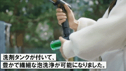 洗車で便利な機能として、洗剤を自動供給するボトル付き(アタッチメント式)。洗剤を混ぜるひと手間が省けます。しかも泡の量がスイッチで切り替えらて、洗車にこだわる方の要望にも応えてくれそうです。