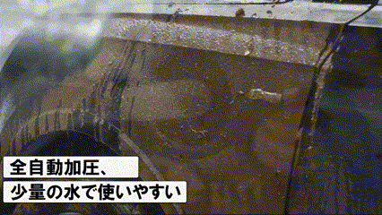 水道からホースを通って辿り着いた水流は、ノズル内で勢いを増幅。電源要らずの高圧噴射を実現しているんです。