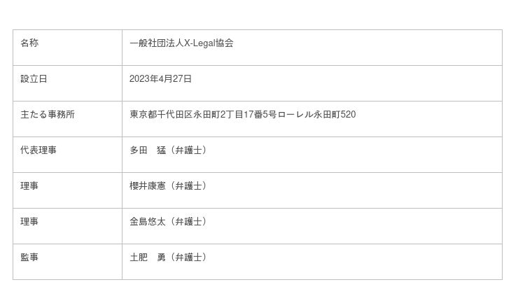 弁護士法人Proceed 多田 猛ほか3名の理事と1名の監事により、「一般社団法人X-Legal協会(クロス・リーガル協会)」(主たる事務所:東京都千代田区永田町、代表理事:多田 猛、英名:X-Legal Association)を設立しました。