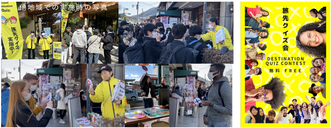 旅先クイズ会は、近くを訪れた観光客が無料で参加できます。そのため、クイズ実施中、どんどん参加する観光客が増え、みんなで一緒にクイズを解くことになります。すると、様々、遠方から来られた国内外の観光客同士が仲良くなり、連絡先交換をする事例もありました。このように、旅先クイズ会は、その地域の交流拠点となります。